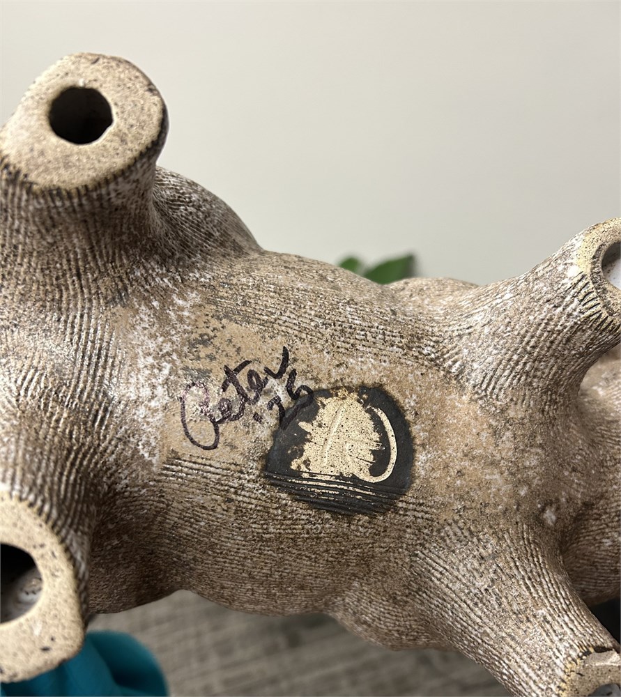 Handcrafted and glazed by Peter Woods, founder of Peter’s Pottery in Mound Bayou, Mississippi, this stunning ceramic pig is truly one of a kind. Its deep, earthy tones of slate, bronze, and indigo shimmer with Peter’s signature finish — and no other pig like it exists.